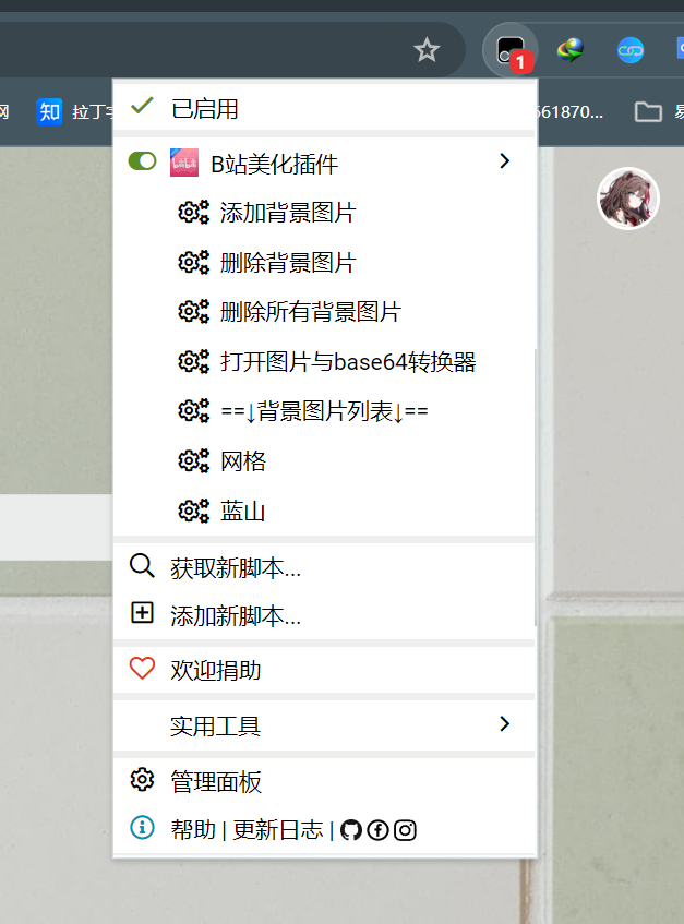 A: 点击浏览器右上角油猴或脚本猫图标, 点击 " 设置(点我切换背景图片)"